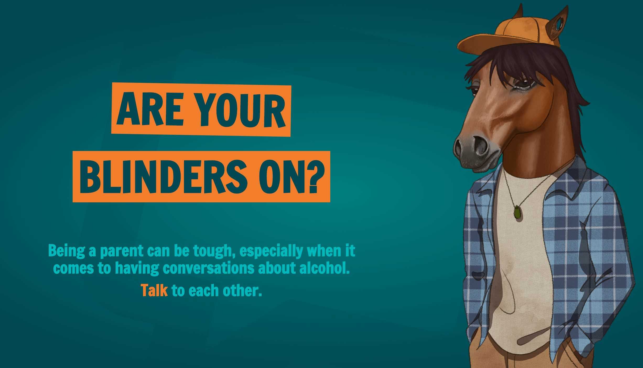 A key aspect of this strategy is a social media campaign which challenges the assumptions and Southland preconceptions that adults have about teen drinking. While we use ‘real life’ quotes from parents, we have made this ‘safe’ by using animated horses as our main characters. A horse with blinders on was selected because it is a strong image representing a lack of knowledge of, or turning a blind eye to, things going on in the periphery.
